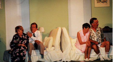 The first play chosen by the group was Murder by Request, and it is a mark of their enthusiasm and dedication that within that first year they managed to perform three plays.  The difficulties they faced do not leave much to the imagination.  It was only a year after the end of the Franco regime and bureaucracy was still a factor to be taken into account.  They managed to get permission to use the old Casa de la Falange later renamed Casa de Cultura, which has now been pulled down and replaced by a new building also called the Casa de Cultura.  The Casa de la Falange was he local headquarters of the followers of Franco and was more suited to political meetings and military salutes etc., from the ancient balconies.  But it was a start.  There are many stories about that time: for instance, to obtain enough electricity for the minimum required for stage lighting they had to tap into the street light outside!  Also, as the Casa de la Falange was situated at the top of the Calle Mayor in the pueblo, it was not unknown for a band to march past with individual musicians trying to outdo the other for decibel prominence!  Meantime all action on the stage had to cease until they had marched past. But all good things come to an end and eventually the Ayuntamiento decided that the old building was becoming too dangerous for further use.  Javea Players had to find another home.