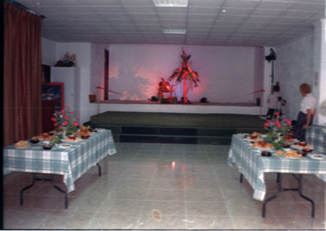 By this time the members could be excused for beginning to think they were doomed to becoming a group of strolling players.   Then we heard that the Union Musical de Gata had a theatre. However, after the Cinema and Disco, the move to the Union Musical theatre could be described as ‘from the sublime to the ridiculous’.  Understandably, it had been designed by Union Musical as a concert hall with no thought for using it for plays. But one thing our members have never lacked is ingenuity, and this was stretched to the limit at Gata.  There were no wings, and the only access down below to the dressing room was down a metal staircase in the corner stage left. The set had to be free standing, and an ‘A’ frame had to be manufactured, supported either side by structures standing on the stage.  Also the electricity supply was inadequate.   However the Union Musical people were very cooperative and a three-phase supply was installed.  Despite the limitations we have staged many ambitious productions at Gata, with much success.